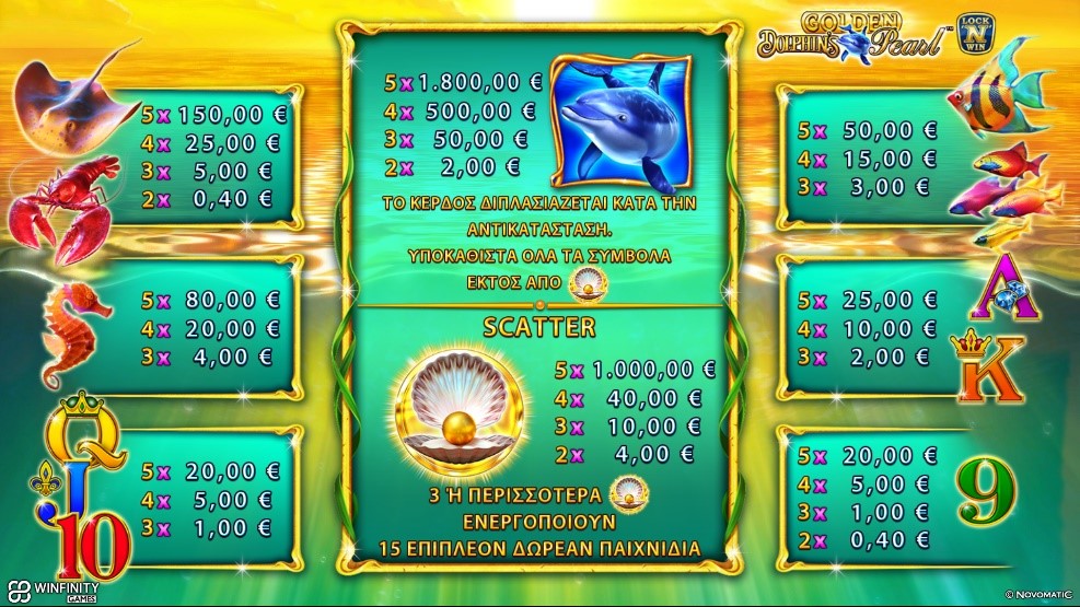 Το «CC Golden Dolphin’s Pearls» είναι ένα παιχνίδι με 5 κυλίνδρους και 10 γραμμές πληρωμής.