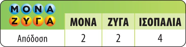 If 12 ‘EVENS’ και 8 ‘ODDS’ numbers are drawn, then you win 10€ (2 times your stake).