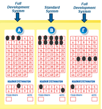 Playing with combination systems, the requested 6 numbers should be selected in a combination of 2 or 3 playing areas of the slip.