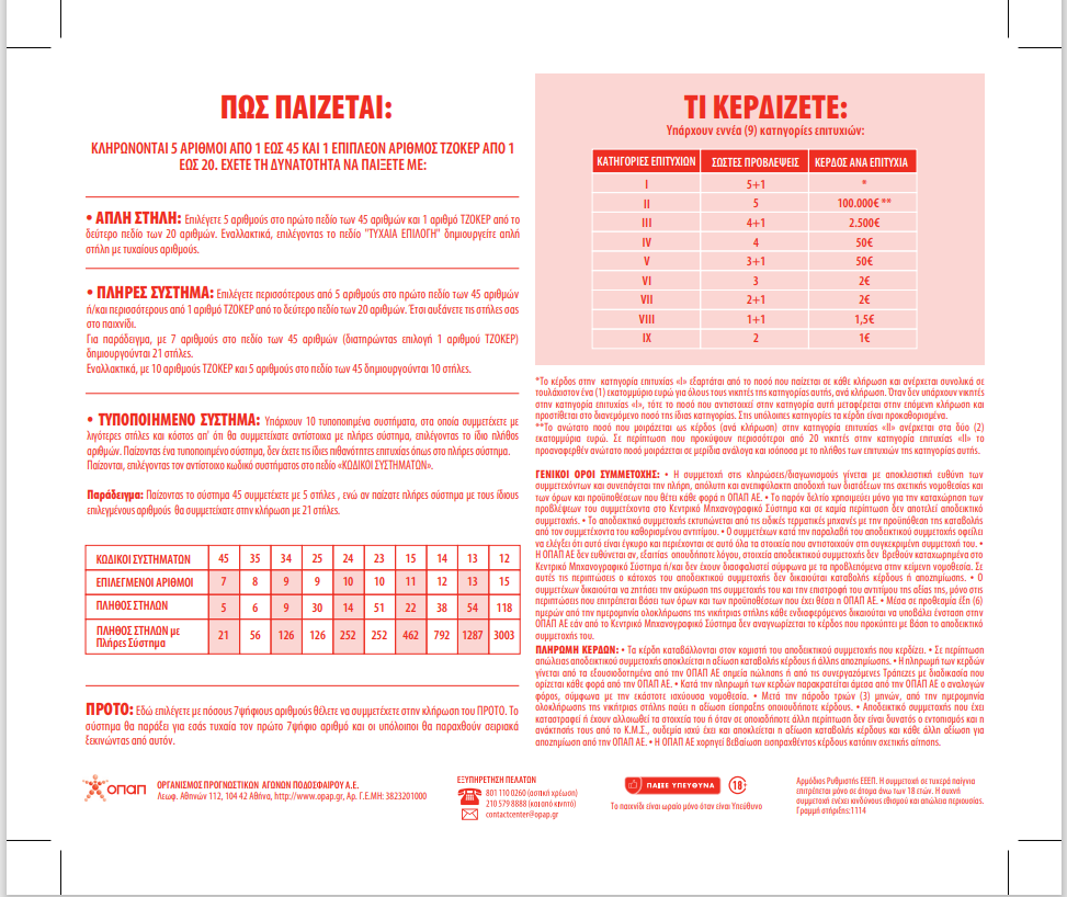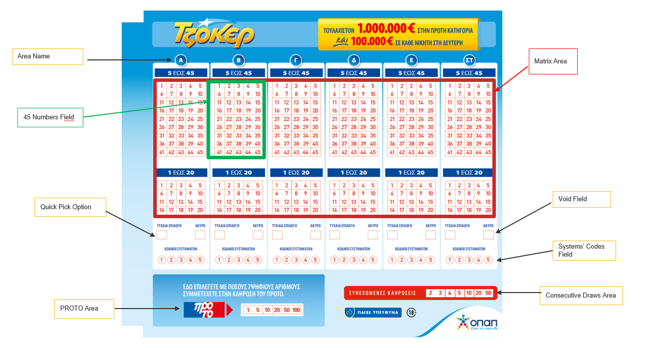 There is also the option to participate in PROTO (with up to 186 consecutive numbers), by marking the area at the bottom left side of a TZOKER slip.