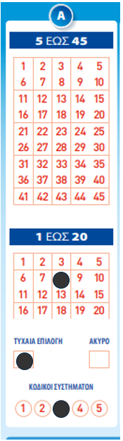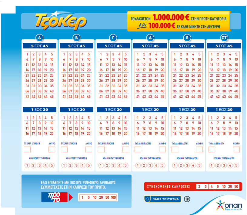 TΖΟΚΕR is a modern game of chance. Its objective is to predict 5 numbers (out of 45) and 1 TZOKER number (out of 20). It is played with single columns or using systems (full, standard or combined).